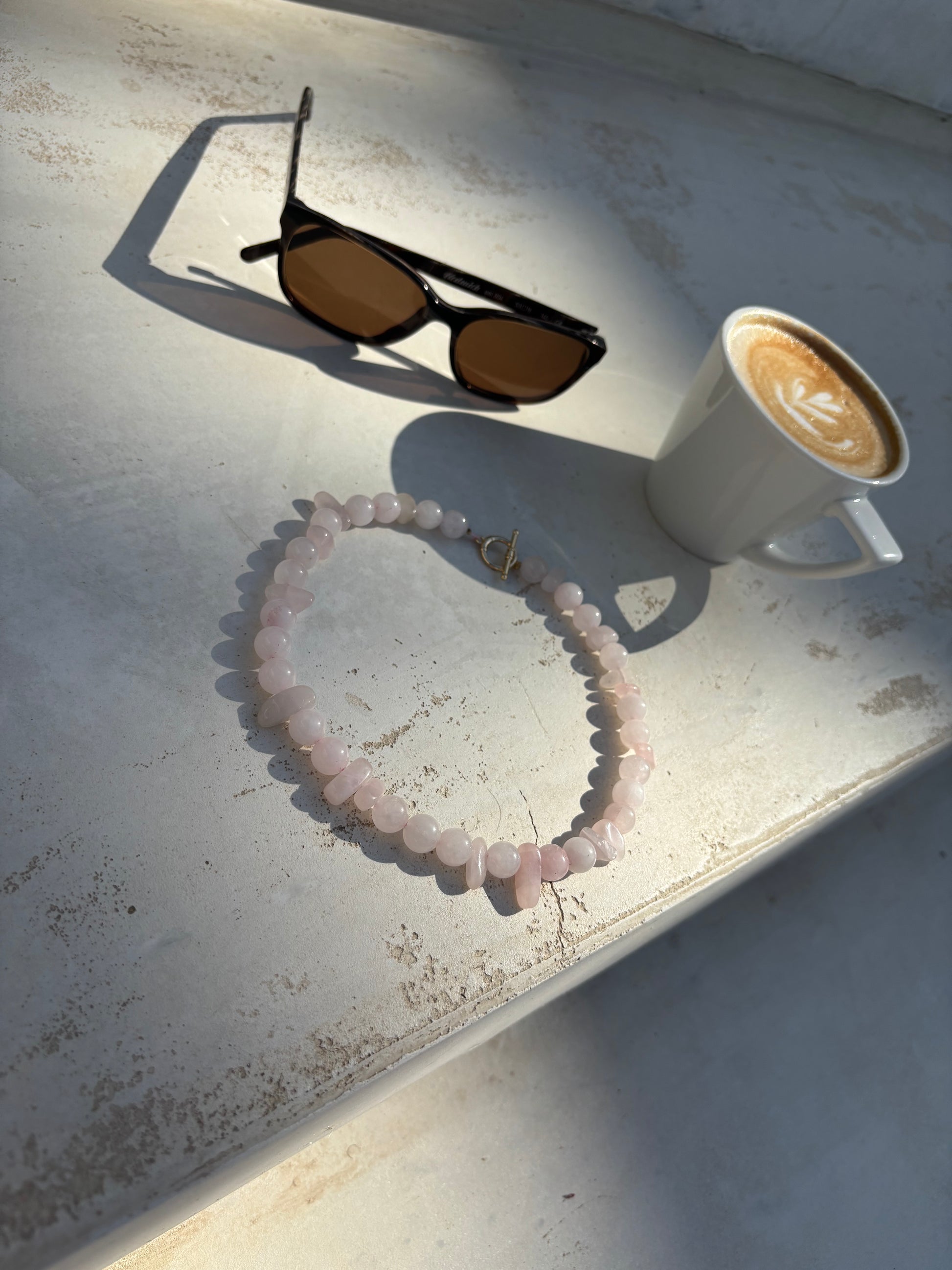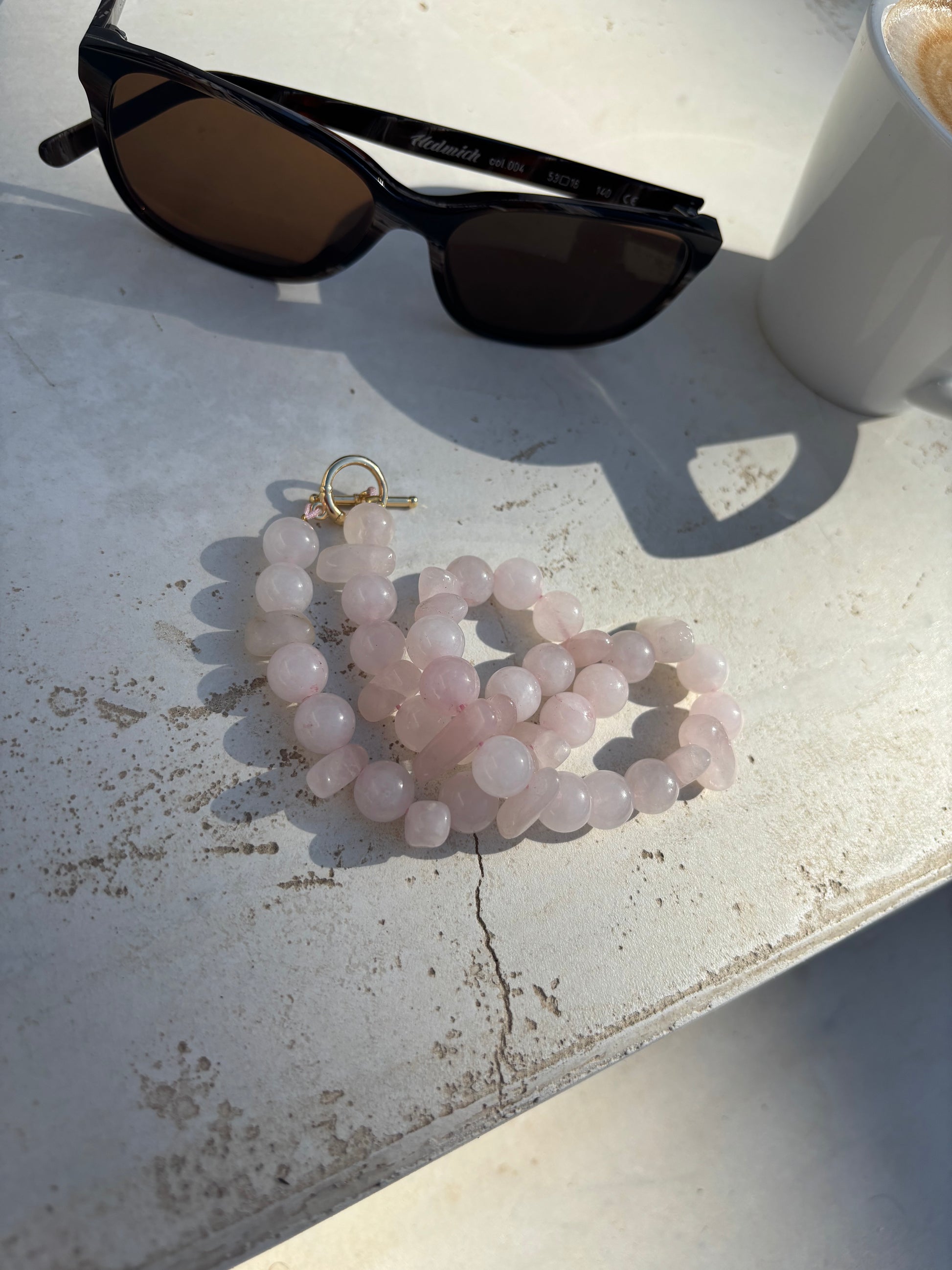 Rose'line kombiniert 10 mm große, rund geschliffene Rosenquarz-Perlen mit unregelmäßigen Nuggets. Der Rosenquarz gilt als Stein des Herzens.